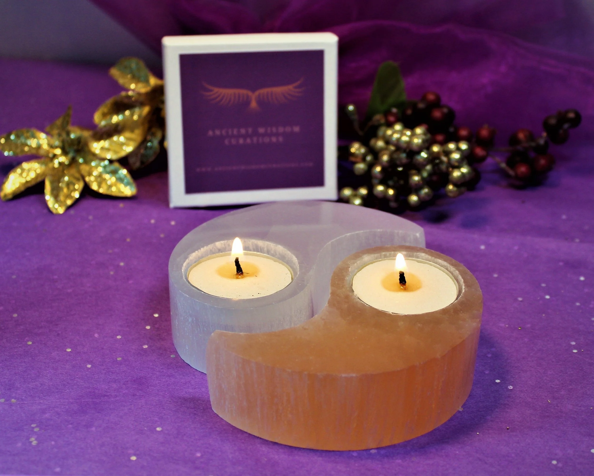 Light also plays an important role in Eastern practice — the flame of a candle representing clarity, truth, and the inner self. A Yin Yang selenite tealight set reflects the balance between power and compassion, while the warm glow of a peach selenite candle can transform a quiet space into one of reflection and serenity.